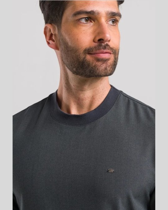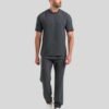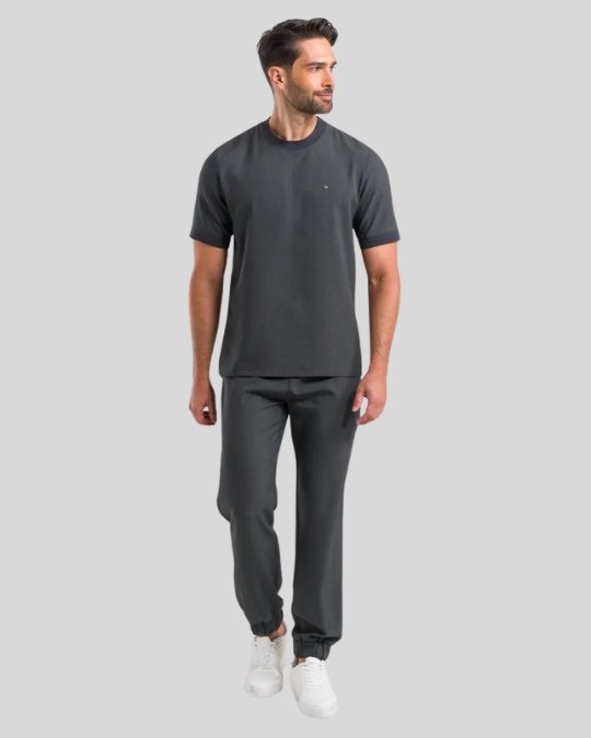 Este Scrub está confeccionado en un material de 95% poliéster y 5% elastano. La blusa cuenta con cuello redondo (gola careca) en acabado de tejido rectilíneo y una etiqueta tipo clip externa en el dobladillo. El pantalón posee elástico en la cintura y en los bajos (tobillos), además de un cordón ajustable para mayor comodidad.