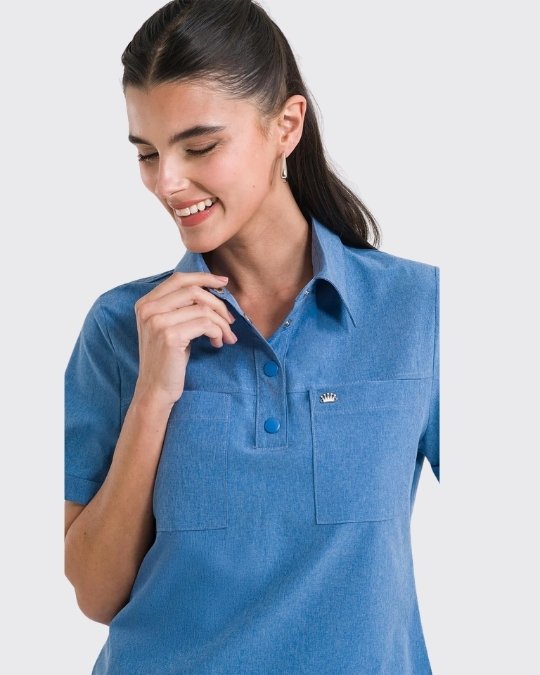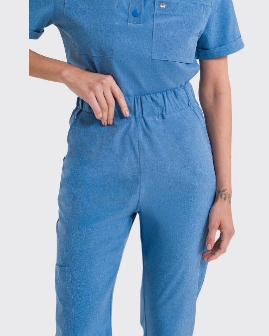 La blusa cuenta con cuello tipo polo, botones de presión, bolsillos frontales utilitarios y mangas dobladas, combinando funcionalidad y estilo. El pantalón, con bolsillos laterales y dobladillo con elástico para ajuste, completa el conjunto con practicidad y un ajuste impecable.